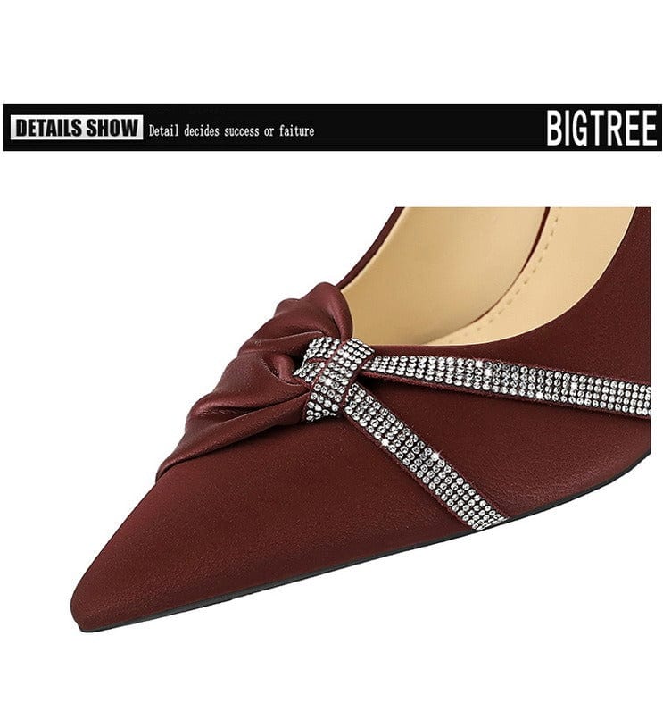 Step into timeless elegance with these pointed-toe stiletto heels, featuring a sparkling crystal bow and light glossy lychee-textured material.