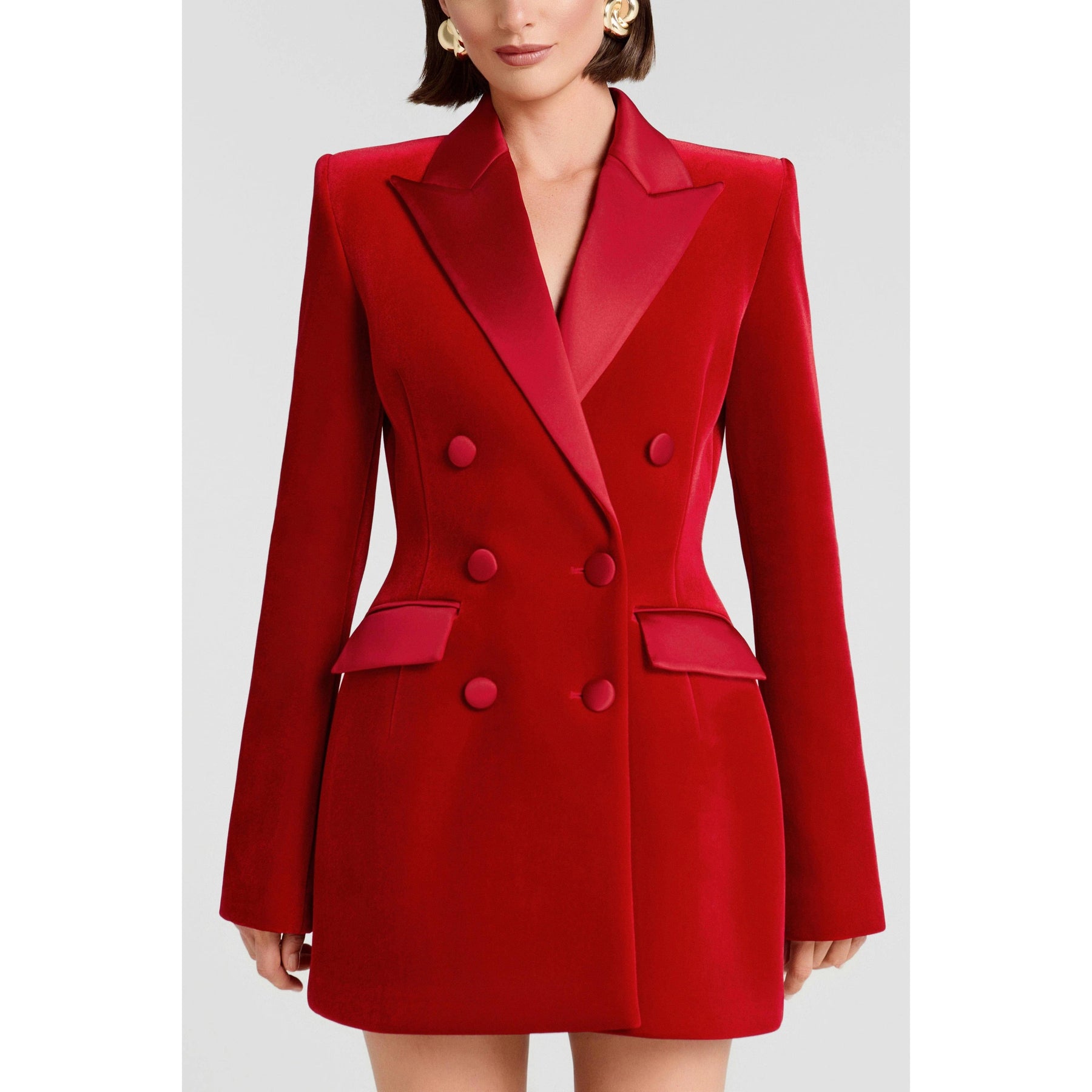 Keywords: women’s red velvet blazer, satin lapel jacket, double-breasted blazer, formal blazer for women, evening wear